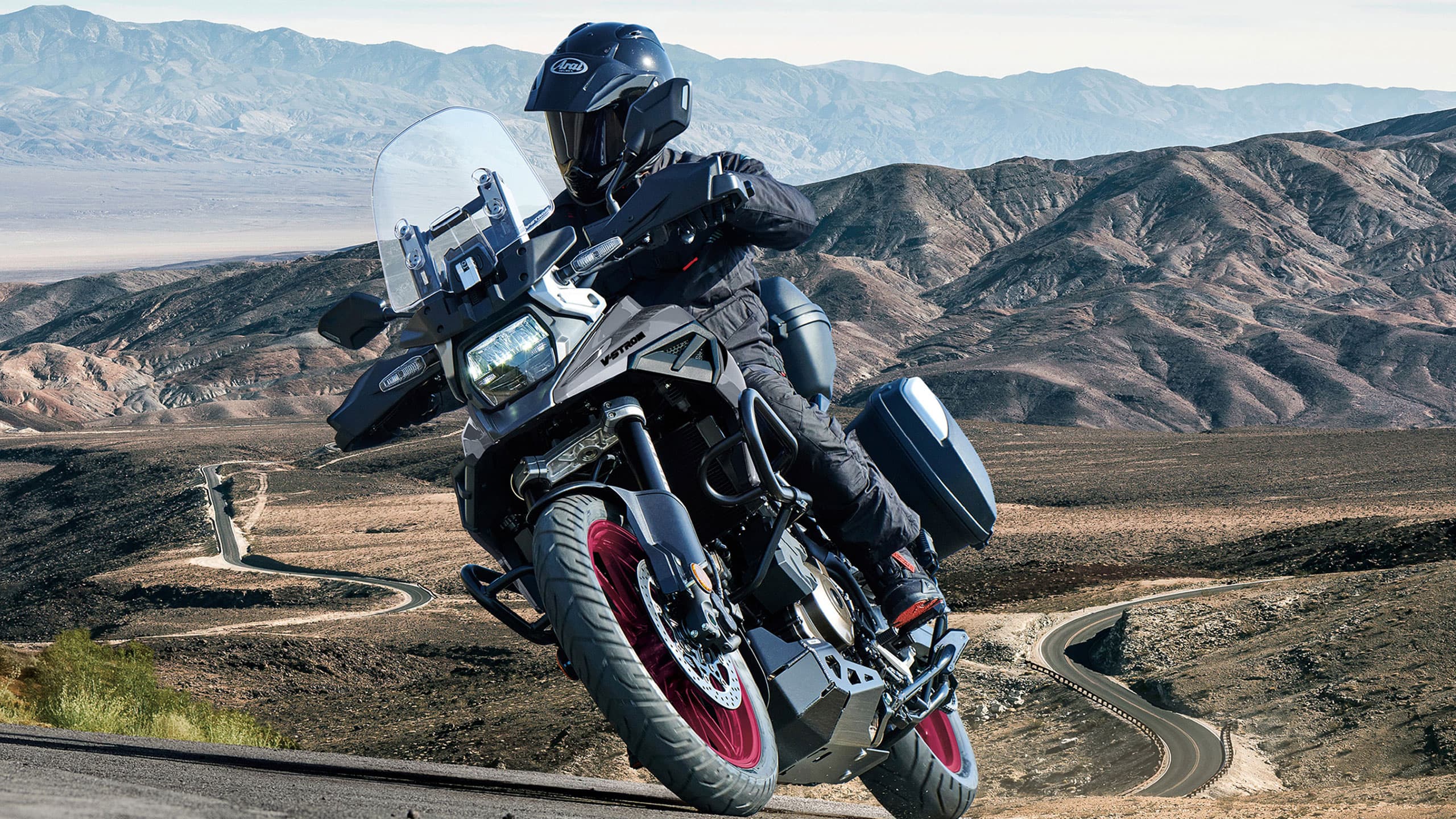 These new models offer you a choice geared toward your desire to explore different types of adventure. The V-Strom 1050DE has enhanced performance and control when exploring further on gravel and dirt with its 21-inch front wheel, longer travel suspension, bespoke ergonomics, greater ground clearance and gravel specific braking and traction control options and more. The V-Strom 1050 is engineered with a stronger focus on maximising comfort and enjoyment when riding long distances and on paved roads with its 19-inch front wheel, dedicated ergonomics, larger screen, bi-directional quickshifter and a host of other advanced electronic rider aids. If the V-Strom 1050DE sounds more like your kind of bike, rather than the 1050 please click the link below, otherwise please scroll down to discover all the amazing features and benefits of owning a V-Strom 1050.